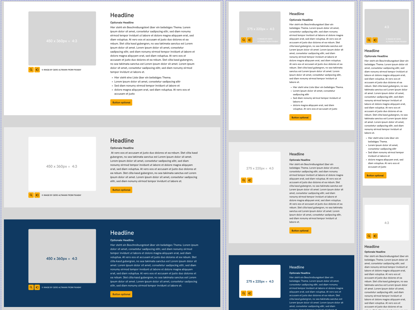 Neben den normalen Überschriften Elementen gibt es auch viele Text-Bild-Elemente. In Containern platziert, können sie unterschiedliche Hintergründe haben.